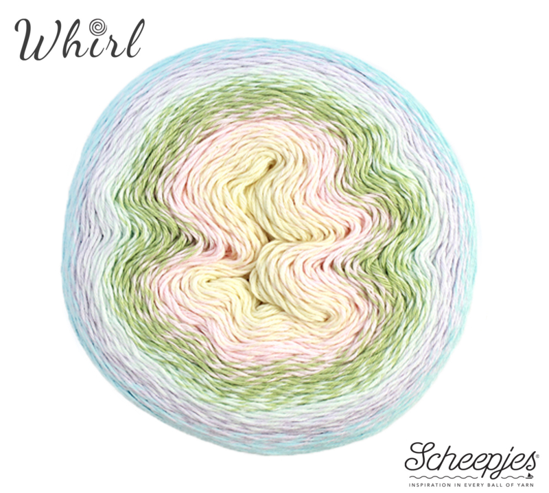 Scheepjes Whirl is een mooi, soepel vallend garen met een prachtig kleurverloop. Het is een zogenaamd unicatgaren, waarbij de kleuren per draad verspringen. Dit zorgt voor vloeiende, natuurlijke kleurwisslingen. Scheepjes Whirl is volledig getwijnd, wat voorkomt dat het garen bij snel breien of haken splijt. Elke kleurwisseling is zorgvuldig met de hand verwerkt. Het kan echter voorkomen dat het garen op de plek van de kleurovergang enigszins pluist (de zogenaamde 'fuzzbuzz'). Om dit op te lossen, kun je het topje van je vingers natmaken en de fuzzbuzz tussen je vingers glad draaien, zodat je project een mooie gladde afwerking krijgt. Door het soepele resultaat is Scheepjes Whirl perfect voor (kant)sjaals, accessoires, kleding en stijlvolle home deco-projecten. De extra lange looplengte van de garencakes maakt dat één cake al genoeg is voor een grote sjaal of omslagdoek.